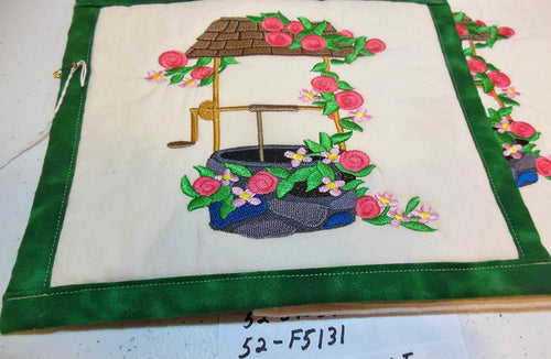 The kitchen towels are flour sack towels approximately 30"x30". The potholders are 9.5"x8.5" with the tops made of muslin and backs of cotton. Each have 2 layers of batting made from 80% cotton and 20% poly. All are pre-washed and ironed.