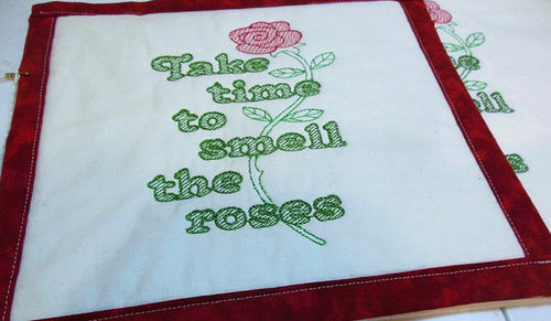 The kitchen towels are flour sack towels approximately 30"x30". The potholders are 9.5"x8.5" with the tops made of muslin and backs of cotton. Each have 2 layers of batting made from 80% cotton and 20% poly. All are pre-washed and ironed.