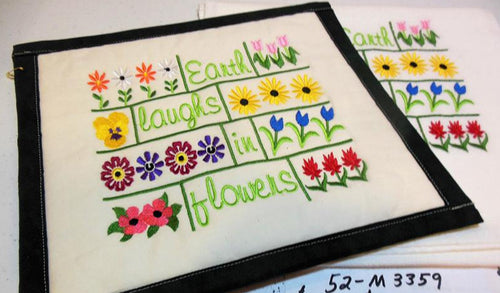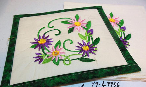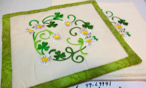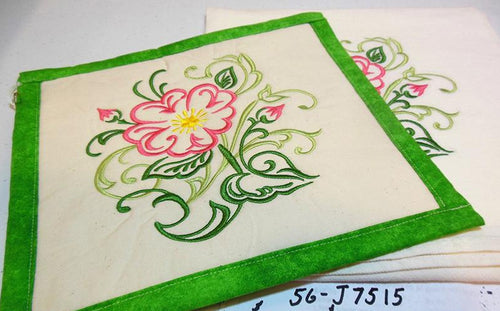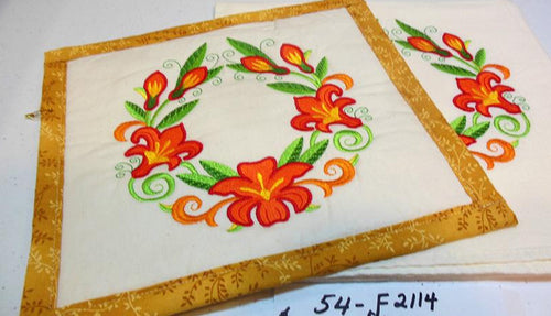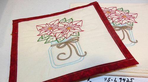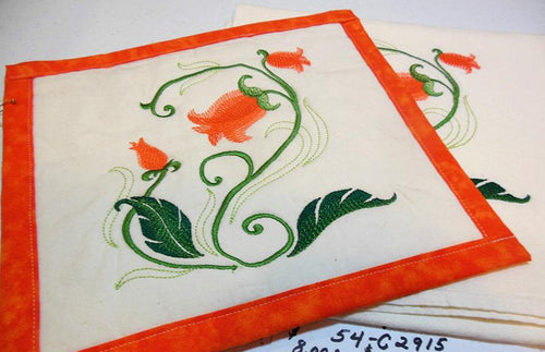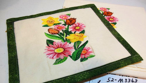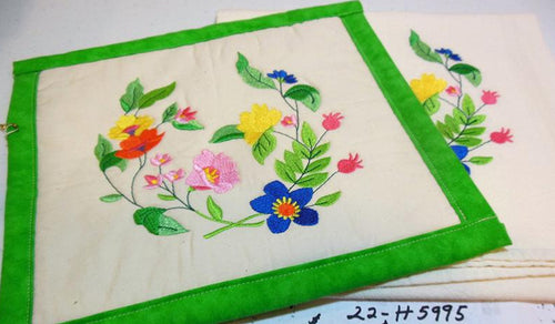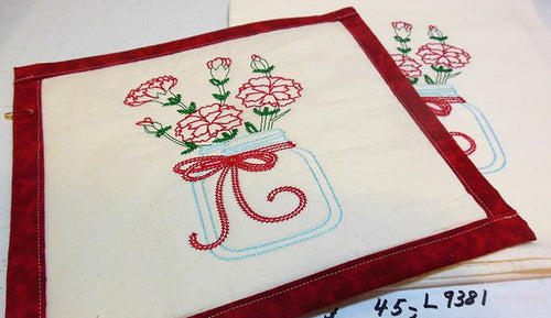 The kitchen towels are flour sack towels approximately 30"x30". The potholders are 9.5"x8.5" with the tops made of muslin and backs of cotton. Each have 2 layers of batting made from 80% cotton and 20% poly. All are pre-washed and ironed.