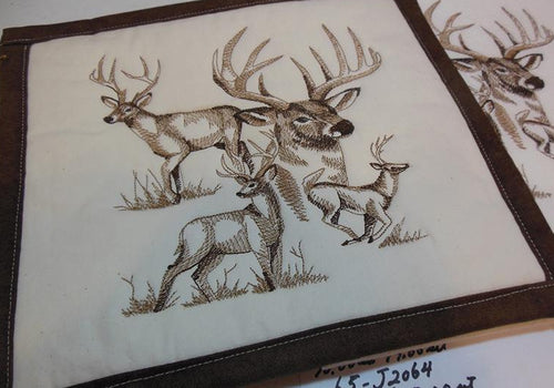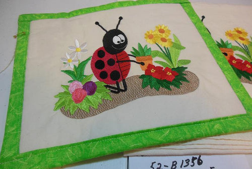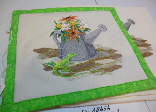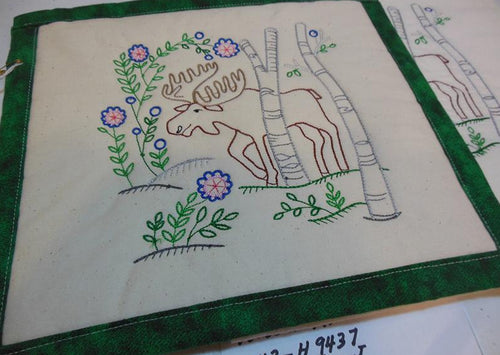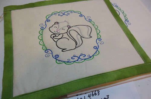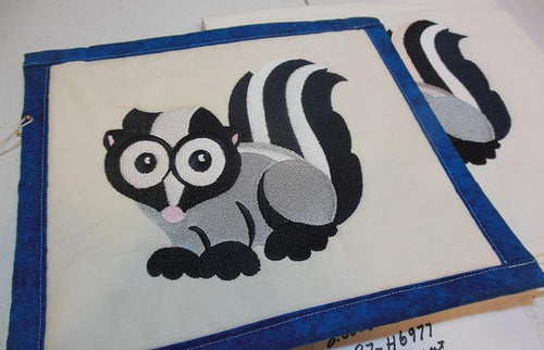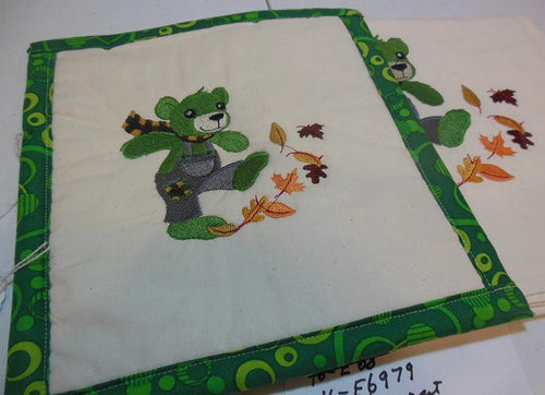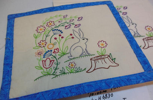 The kitchen towels are flour sack towels approximately 30"x30". The potholders are 9.5"x8.5" with the tops made of muslin and backs of cotton. Each have 2 layers of batting made from 80% cotton and 20% poly. All are pre-washed and ironed.