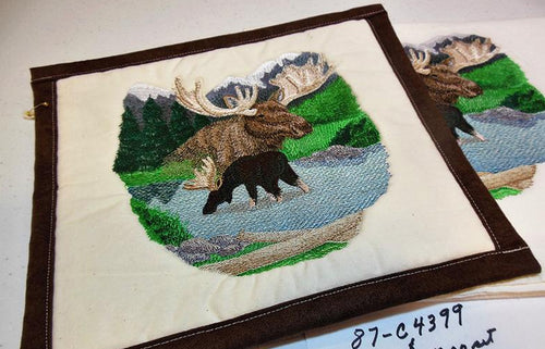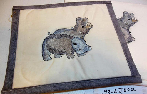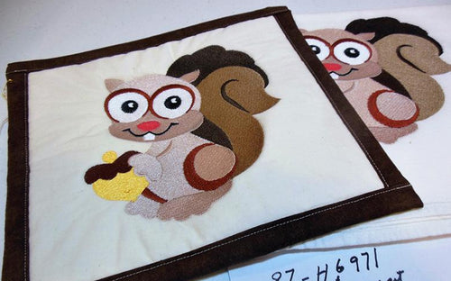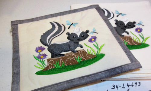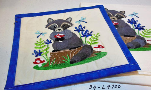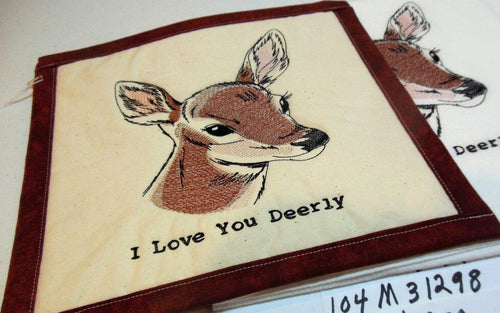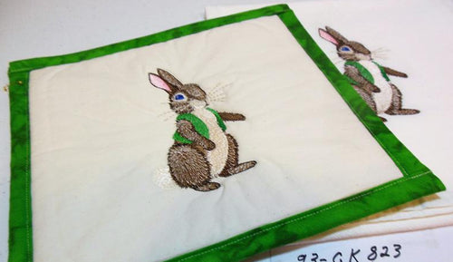 The kitchen towels are flour sack towels approximately 30"x30". The potholders are 9.5"x8.5" with the tops made of muslin and backs of cotton. Each have 2 layers of batting made from 80% cotton and 20% poly. All are pre-washed and ironed.