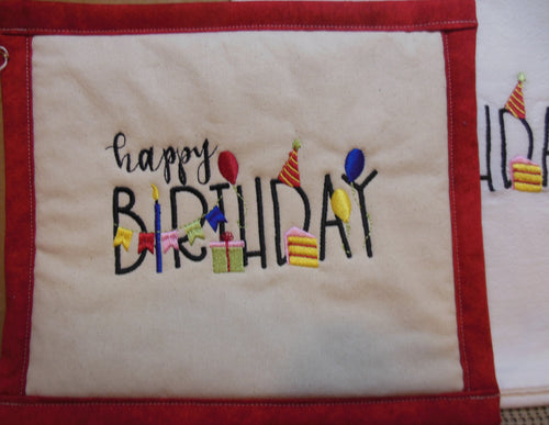 The kitchen towels are flour sack towels approximately 30"x30". The potholders are 9.5"x8.5" with the tops made of muslin and backs of cotton. Each have 2 layers of batting made from 80% cotton and 20% poly. All are pre-washed and ironed.