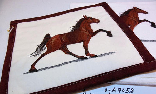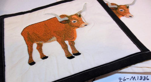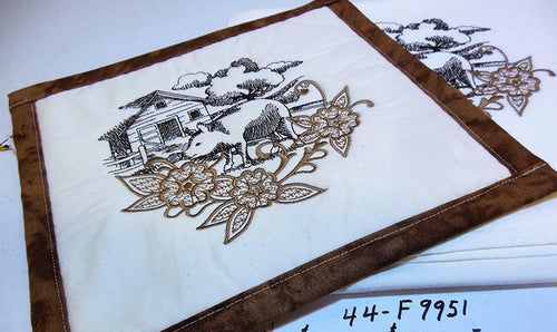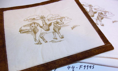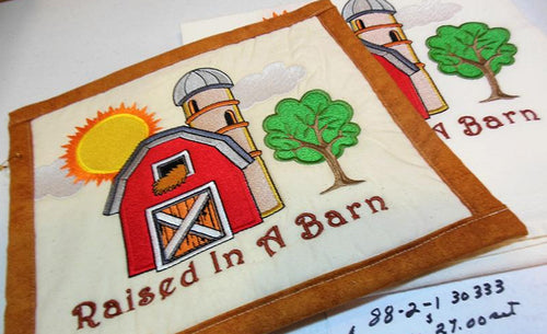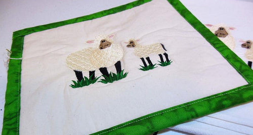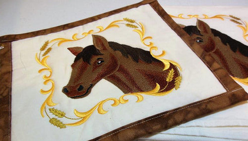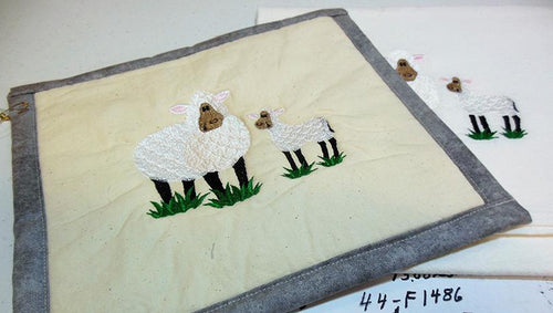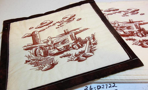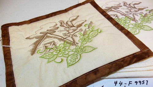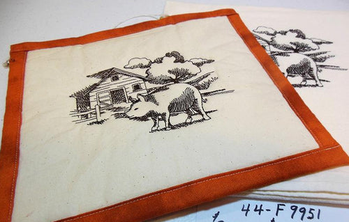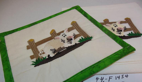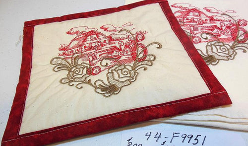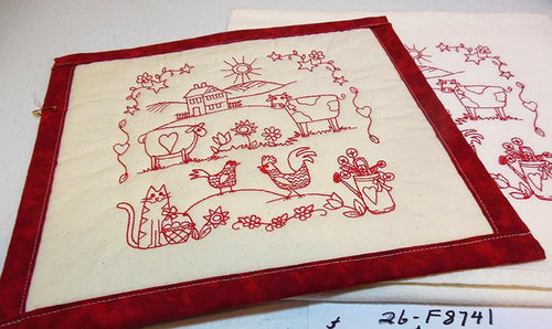 The kitchen towels are flour sack towels approximately 30"x30". The potholders are 9.5"x8.5" with the tops made of muslin and backs of cotton. Each have 2 layers of batting made from 80% cotton and 20% poly. All are pre-washed and ironed.