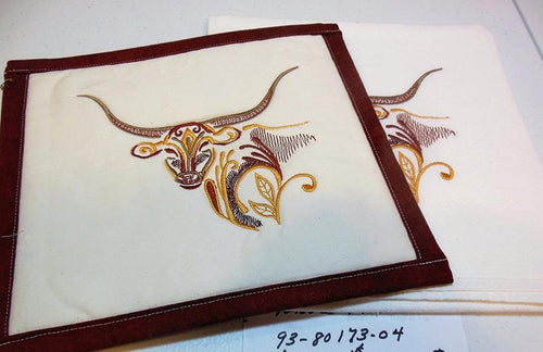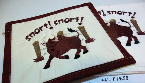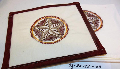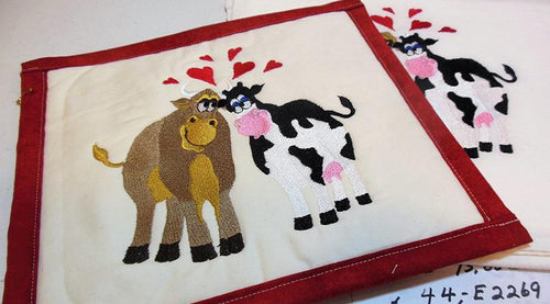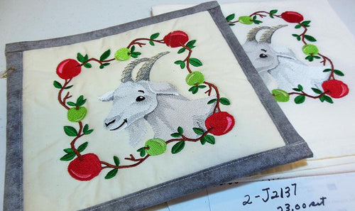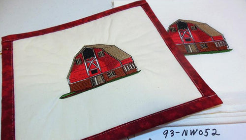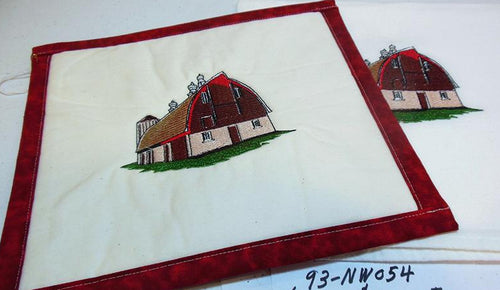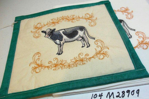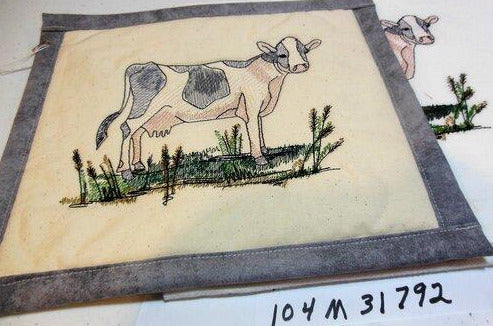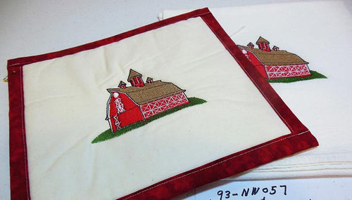 The kitchen towels are flour sack towels approximately 30"x30". The potholders are 9.5"x8.5" with the tops made of muslin and backs of cotton. Each have 2 layers of batting made from 80% cotton and 20% poly. All are pre-washed and ironed.