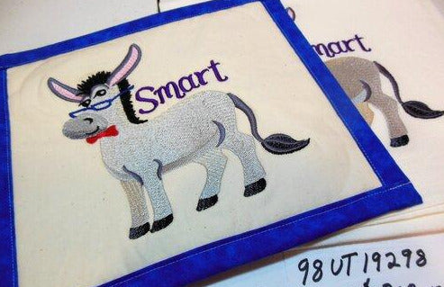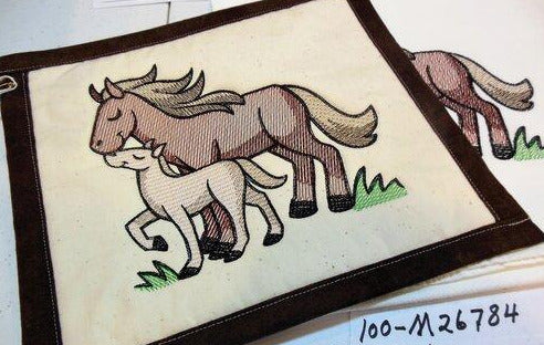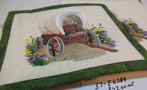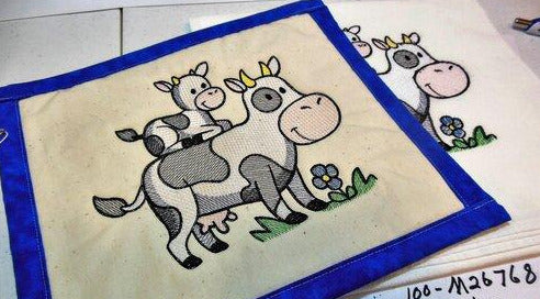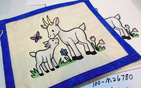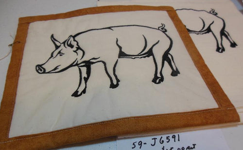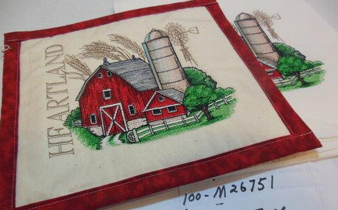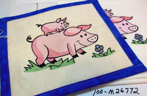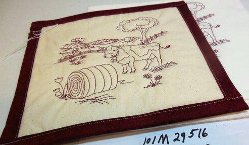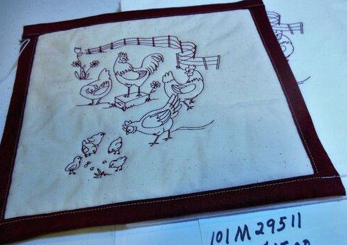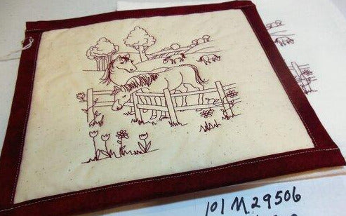 The kitchen towels are flour sack towels approximately 30"x30". The potholders are 9.5"x8.5" with the tops made of muslin and backs of cotton. Each have 2 layers of batting made from 80% cotton and 20% poly. All are pre-washed and ironed.