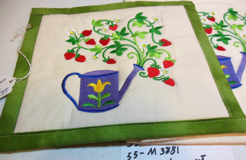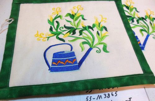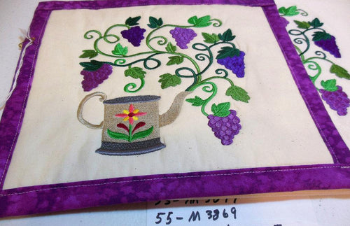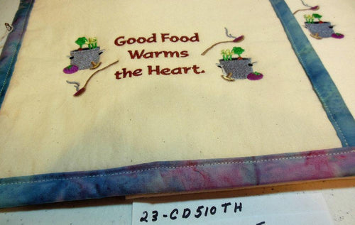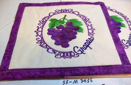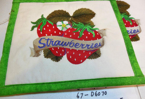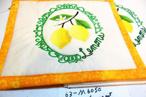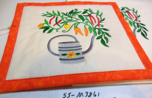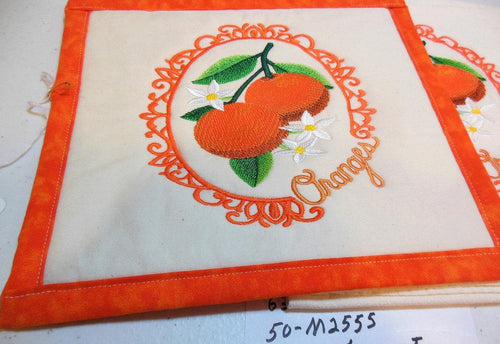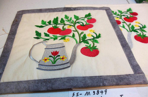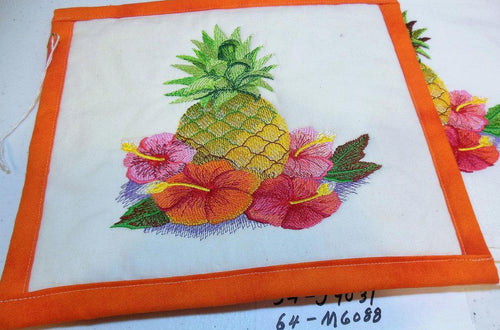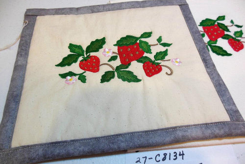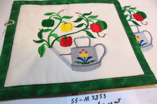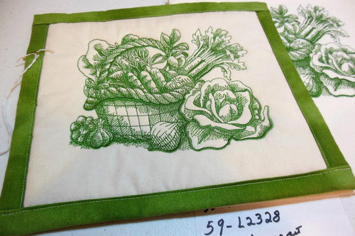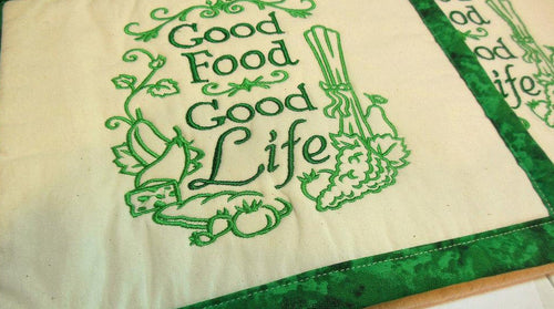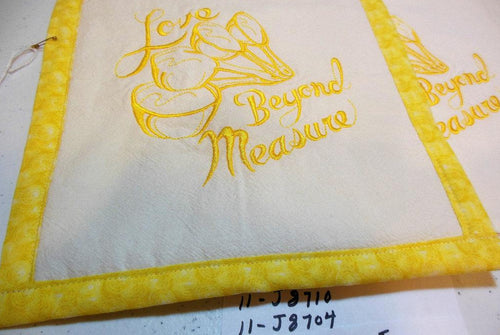 The kitchen towels are flour sack towels approximately 30"x30". The potholders are 9.5"x8.5" with the tops made of muslin and backs of cotton. Each have 2 layers of batting made from 80% cotton and 20% poly. All are pre-washed and ironed.