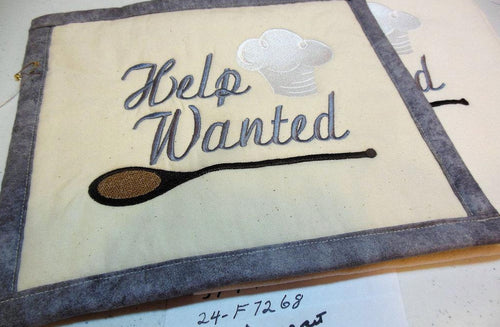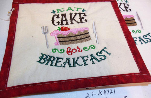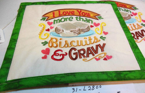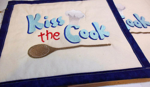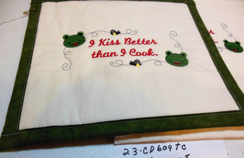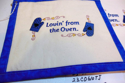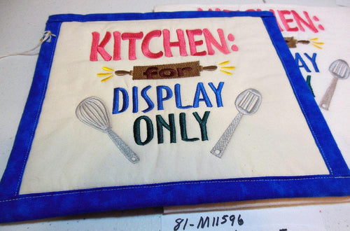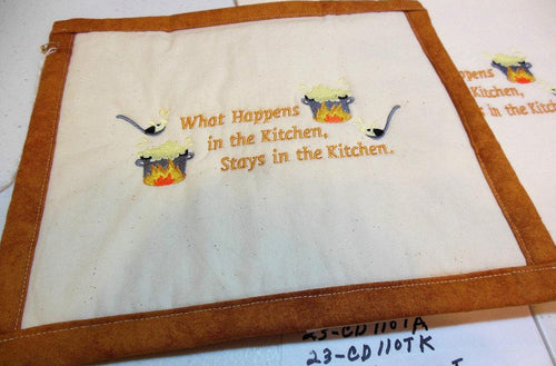 The kitchen towels are flour sack towels approximately 30"x30". The potholders are 9.5"x8.5" with the tops made of muslin and backs of cotton. Each have 2 layers of batting made from 80% cotton and 20% poly. All are pre-washed and ironed.