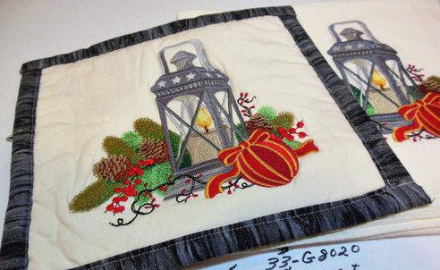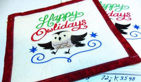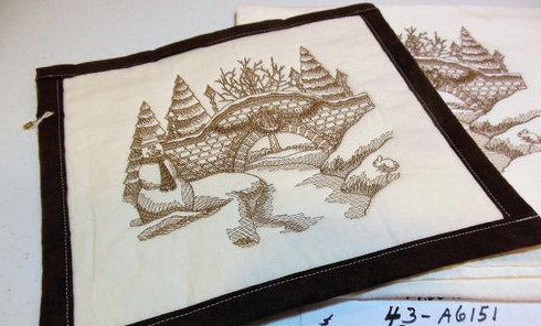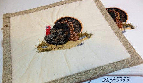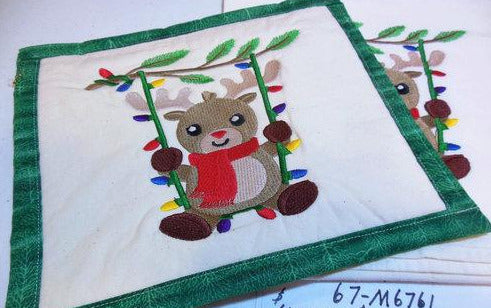 The kitchen towels are flour sack towels approximately 30"x30". The potholders are 9.5"x8.5" with the tops made of muslin and backs of cotton. Each have 2 layers of batting made from 80% cotton and 20% poly. All are pre-washed and ironed.