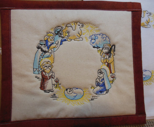 The kitchen towels are flour sack towels approximately 30"x30". The potholders are 9.5"x8.5" with the tops made of muslin and backs of cotton. Each have 2 layers of batting made from 80% cotton and 20% poly. All are pre-washed and ironed.