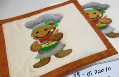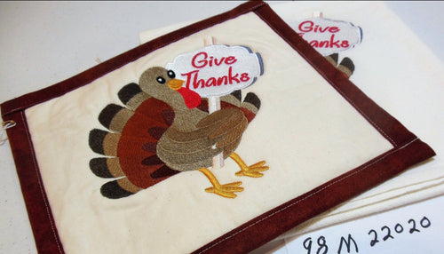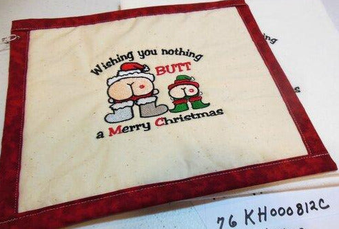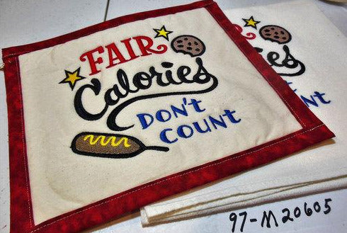 The kitchen towels are flour sack towels approximately 30"x30". The potholders are 9.5"x8.5" with the tops made of muslin and backs of cotton. Each have 2 layers of batting made from 80% cotton and 20% poly. All are pre-washed and ironed.