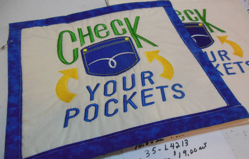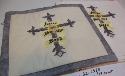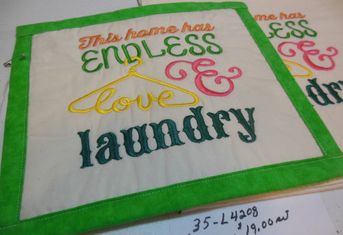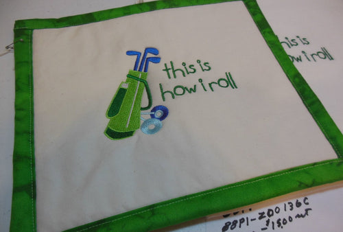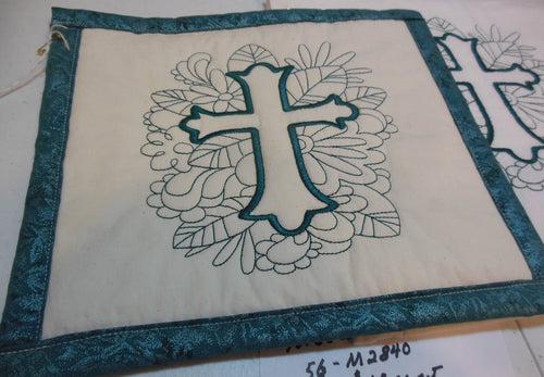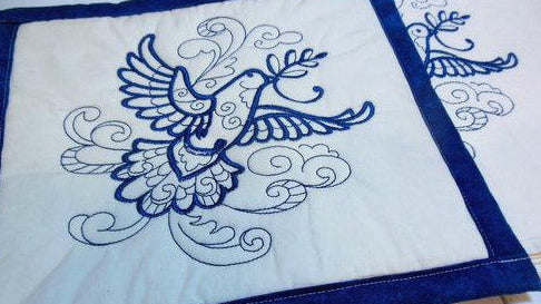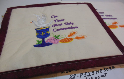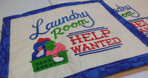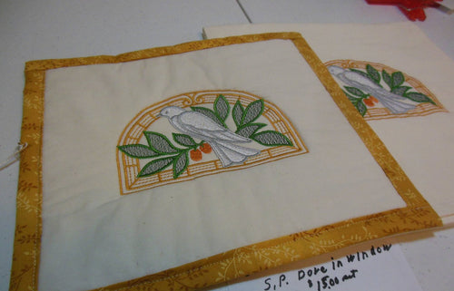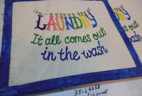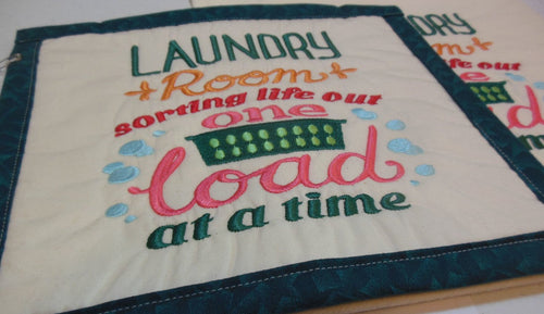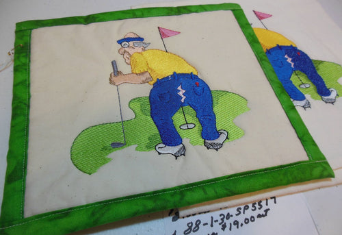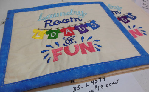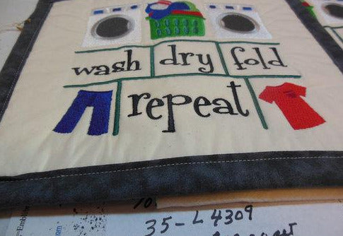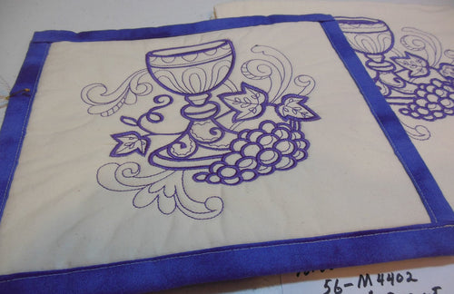 The kitchen towels are flour sack towels approximately 30"x30". The potholders are 9.5"x8.5" with the tops made of muslin and backs of cotton. Each have 2 layers of batting made from 80% cotton and 20% poly. All are pre-washed and ironed.