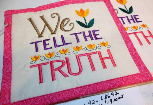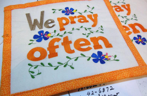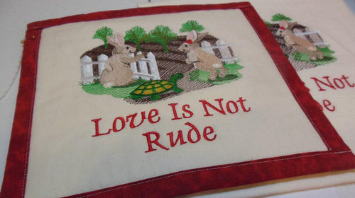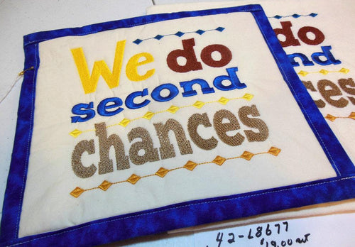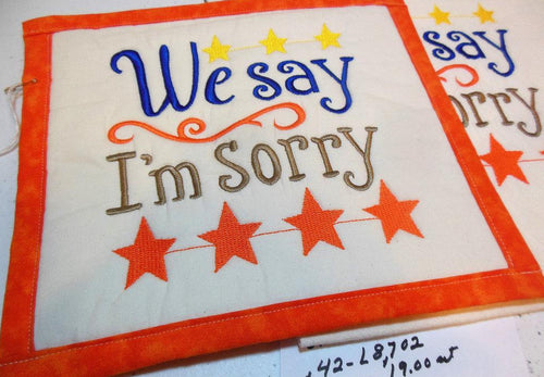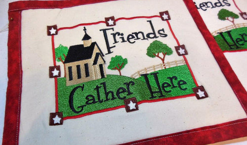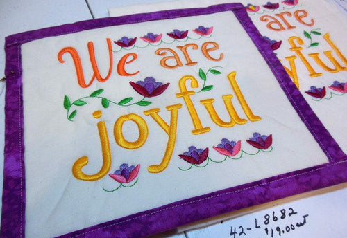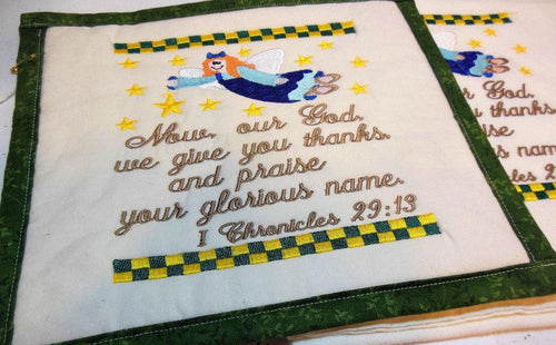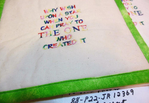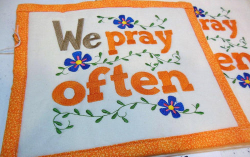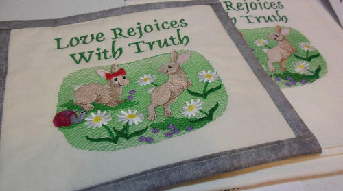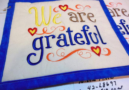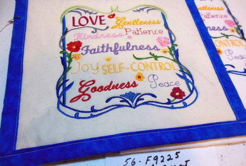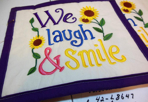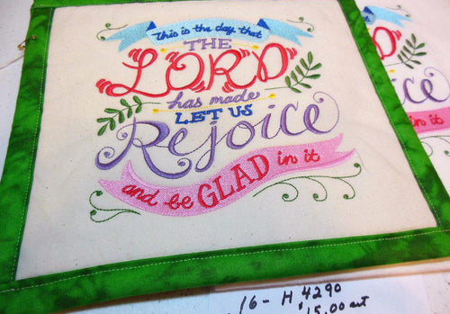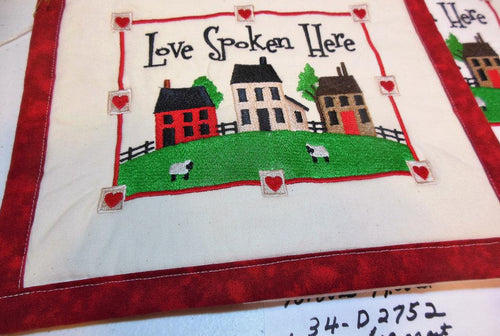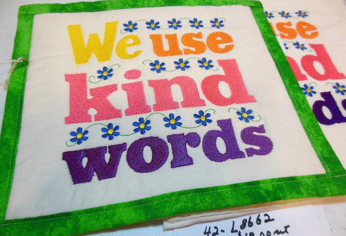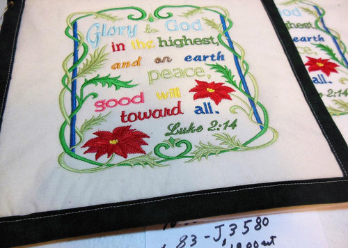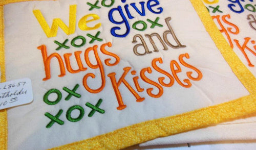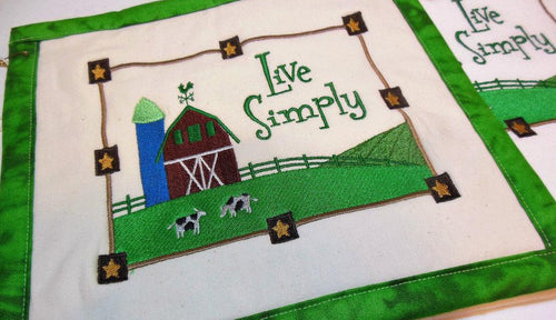 The kitchen towels are flour sack towels approximately 30"x30". The potholders are 9.5"x8.5" with the tops made of muslin and backs of cotton. Each have 2 layers of batting made from 80% cotton and 20% poly. All are pre-washed and ironed.