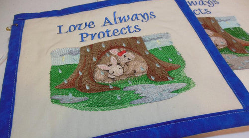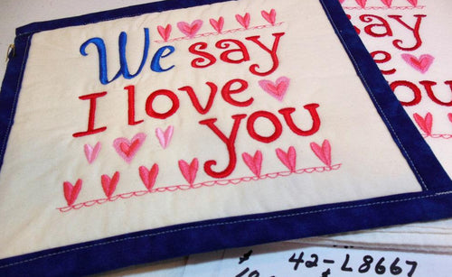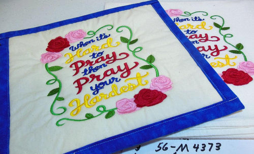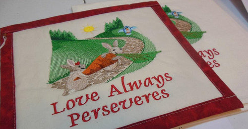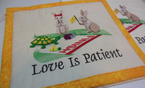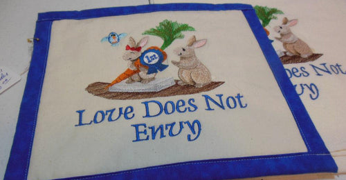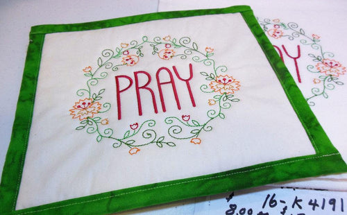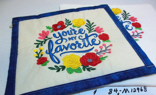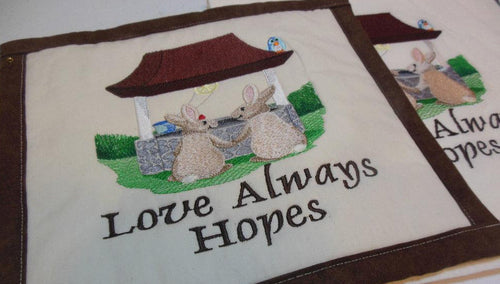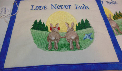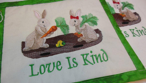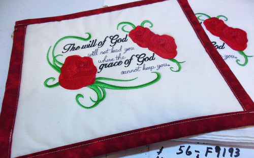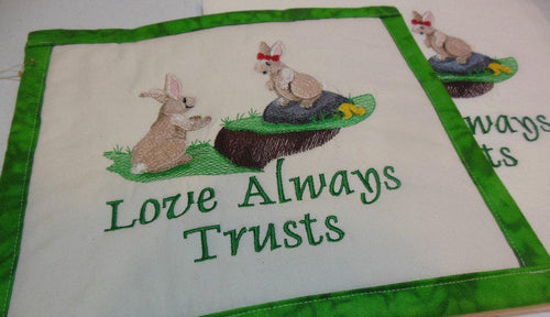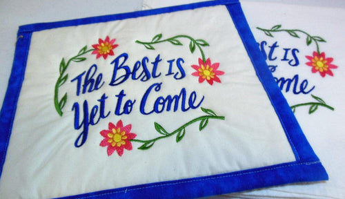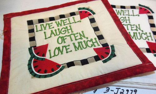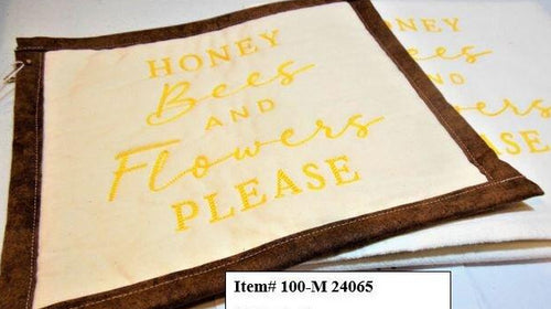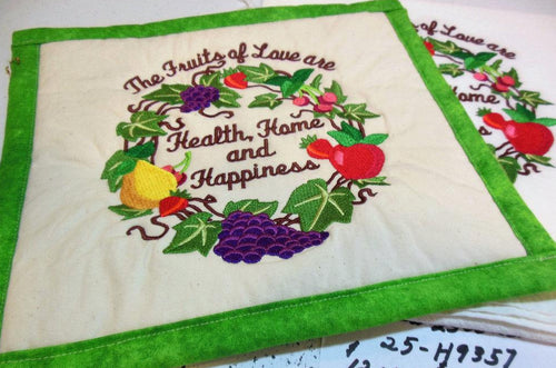 The kitchen towels are flour sack towels approximately 30"x30". The potholders are 9.5"x8.5" with the tops made of muslin and backs of cotton. Each have 2 layers of batting made from 80% cotton and 20% poly. All are pre-washed and ironed.