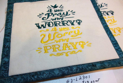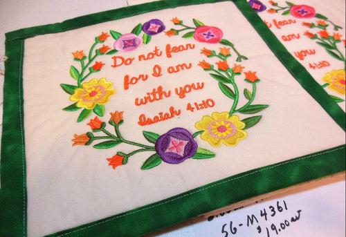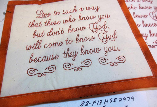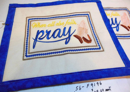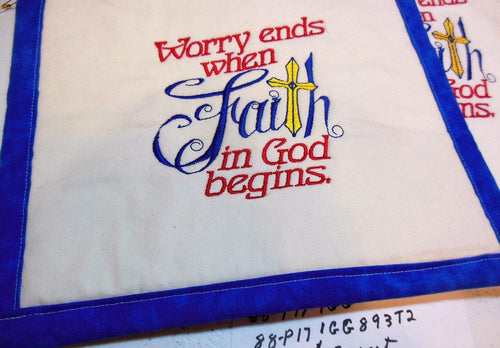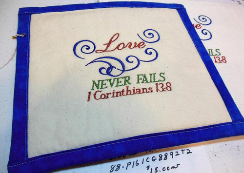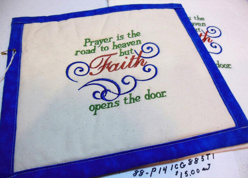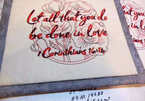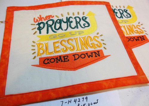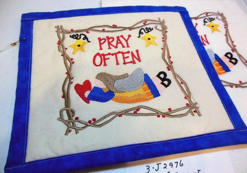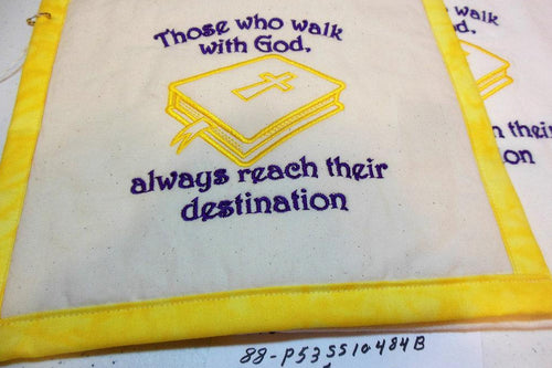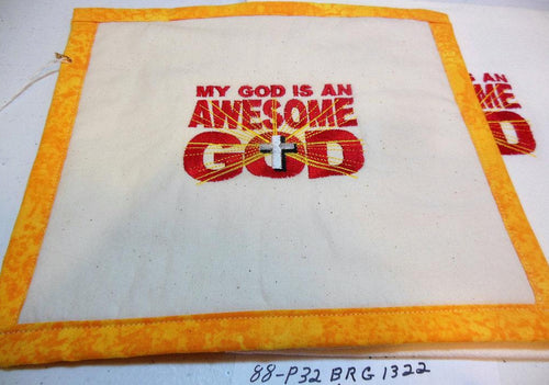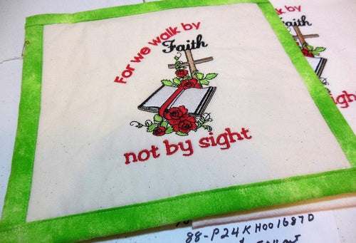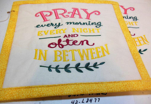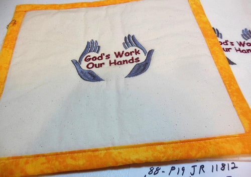 The kitchen towels are flour sack towels approximately 30"x30". The potholders are 9.5"x8.5" with the tops made of muslin and backs of cotton. Each have 2 layers of batting made from 80% cotton and 20% poly. All are pre-washed and ironed.